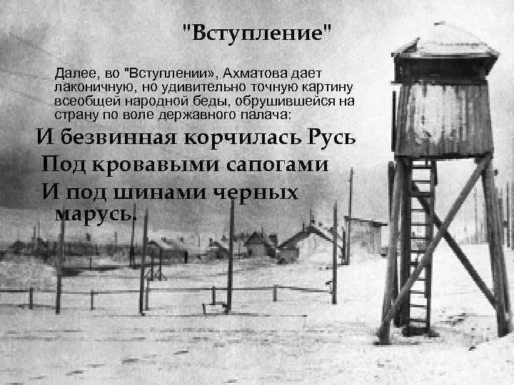 "Вступление" Далее, во "Вступлении» , Ахматова дает лаконичную, но удивительно точную картину всеобщей народной беды, обрушившейся на страну по воле державного палача: И безвинная корчилась Русь Под кровавыми сапогами И под шинами черных марусь.
