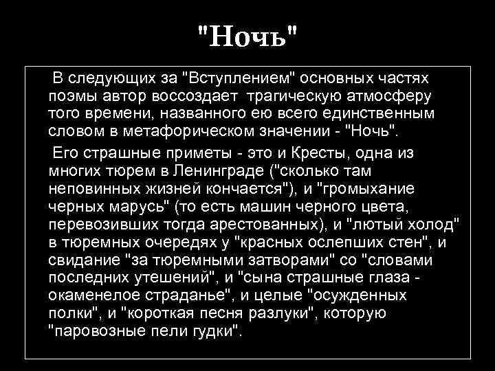 "Ночь" В следующих за "Вступлением" основных частях поэмы автор воссоздает трагическую атмосферу того времени, названного ею всего единственным словом в метафорическом значении - "Ночь". Его страшные приметы - это и Кресты, одна из многих тюрем в Ленинграде ("сколько там неповинных жизней кончается"), и "громыхание черных марусь" (то есть машин черного цвета, перевозивших тогда арестованных), и "лютый холод" в тюремных очередях у "красных ослепших стен", и свидание "за тюремными затворами" со "словами последних утешений", и "сына страшные глаза - окаменелое страданье", и целые "осужденных полки", и "короткая песня разлуки", которую "паровозные пели гудки".