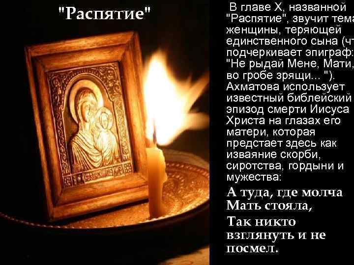 "Распятие" В главе X, названной "Распятие", звучит тема женщины, теряющей единственного сына (чт подчеркивает эпиграф: "Не рыдай Мене, Мати, во гробе зрящи. . . "). Ахматова использует известный библейский эпизод смерти Иисуса Христа на глазах его матери, которая предстает здесь как изваяние скорби, сиротства, гордыни и мужества: А туда, где молча Мать стояла, Так никто взглянуть и не посмел.