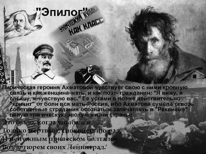 "Эпилог" Лирическая героиня Ахматовой чувствует свою с ними кровную связь и как женщина-мать, и как поэт- гражданин: "Я вижу, я слышу, я чувствую вас. " Ее устами в поэме действительно "кричит" от боли вся мать-Россия, ибо Ахматова сумела сквозь собственные страдания осознать и запечатлеть в "Реквиеме" целую трагическую эпоху в жизни страны: Это было, когда улыбался Только мертвый, спокойствию рад, И ненужным привеском болтался Возле тюрем своих Ленинград.