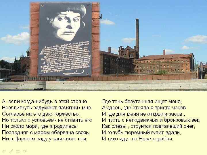 Тема памятника Давая "согласие» на возведение памятника, Ахматова ставит одно существенное условие: памятник ей должен быть воздвигнут только у тюремных стен, где ей, как и всем, "не открыли засов", на берегу родной Невы. В 2006 году напротив знаменитых «крестов» был открыт памятник Анне Ахматовой. Скульптор Галина Додонова.