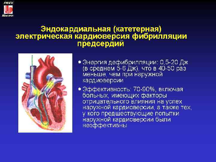 Электрическая дефибрилляция Показания к ЭИТ у больных с МА: • персистирующая МА или пароксизм МА, -протекающий с нарушениями гемодинамики, -при отсутствии эффекта от попыток лекарственной кардиоверсии • постоянная форма ФП Противопоказания к ЭИТ у больных с МА: • дигиталисная интоксикация • эндокардиальные тромбы(по данным ЧП ЭХО-кг) • декомпенсированная сердечная недостаточность