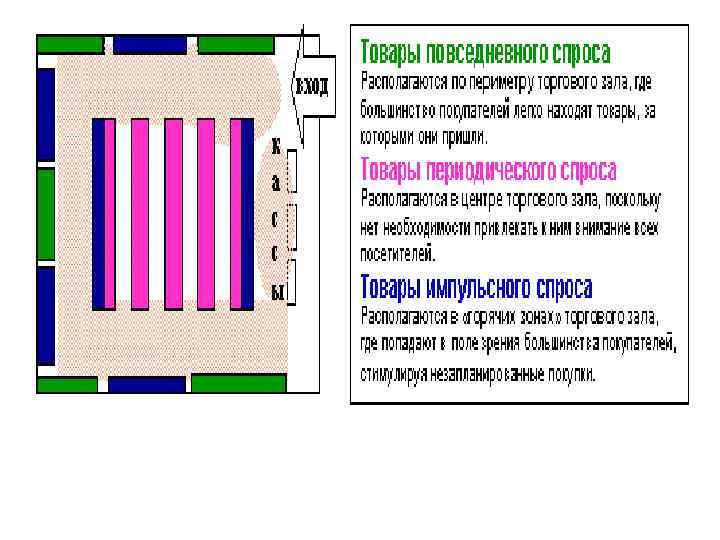 РАЗДЕЛЕНИЕ ТОВАРНЫХ ГРУПП В большинстве случаев при планировании покупки потребитель чётко определяет, какие товарные группы он хочет приобрести (хлеб, молоко, макароны, одежда, обувь, посуда и т. д. ). Весь ассортимент магазина можно разделить на три группы: – Товары повседневного спроса. Покупка этих товаров является целью практически каждого визита покупателя в торговую точку. Их ещё называют магазинообразующими товарными группами. – Товары периодического спроса. Покупка этих товаров планируется один раз в несколько визитов. – Товары импульсного спроса. Покупка этих товаров обычно не планируется. На примере продуктового магазина продемонстрируем эффективное расположение товарных групп в торговом зале.