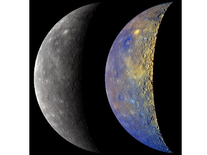 Mercury’s Surface Highly cratered with smooth terrains. Relatively ancient, volcanic surface. Similar to Earth’s Moon, but fewer craters and more “plains”. Geologically longer active than Moon? Plains mostly lava or impact ejecta?