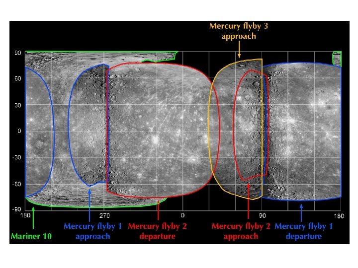 Mariner 10 3 Flybys 1974 -1975 Mariner 10 was the seventh successful launch in the Mariner spacecraft series, and the first to use the gravitational pull of one planet (Venus) to reach another (Mercury). Instruments on board the spacecraft were designed to measure the atmospheric, surface, and physical characteristics of Mercury and Venus. Experiments included television photography, magnetic field, plasma, infrared radiometry, ultraviolet spectroscopy, and radio science detectors. An experimental X-band, high-frequency transmitter was flown for the first time on the spacecraft. 10, 000 pictures with 57% planet coverage reveal an intensely cratered, Moonlike surface and a faint atmosphere of mostly helium, resulting from solar wind bombardment.