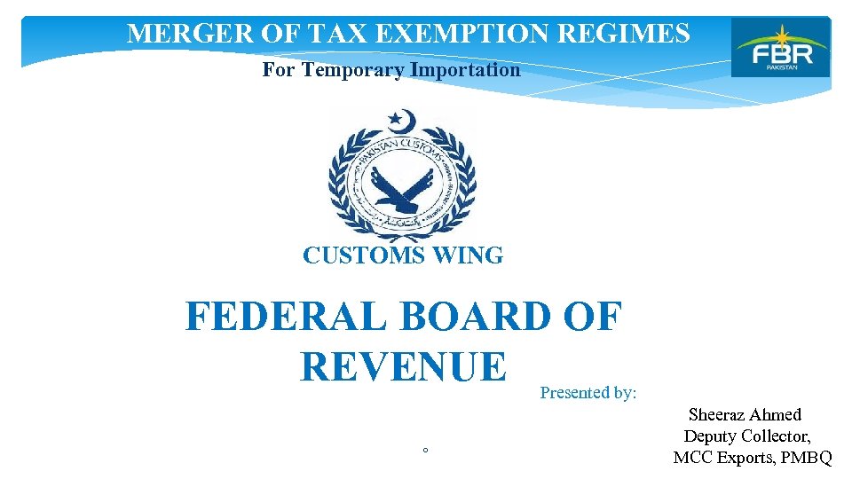 MERGER OF TAX EXEMPTION REGIMES For Temporary Importation CUSTOMS WING FEDERAL BOARD OF REVENUE Presented by: 0 Sheeraz Ahmed Deputy Collector, MCC Exports, PMBQ