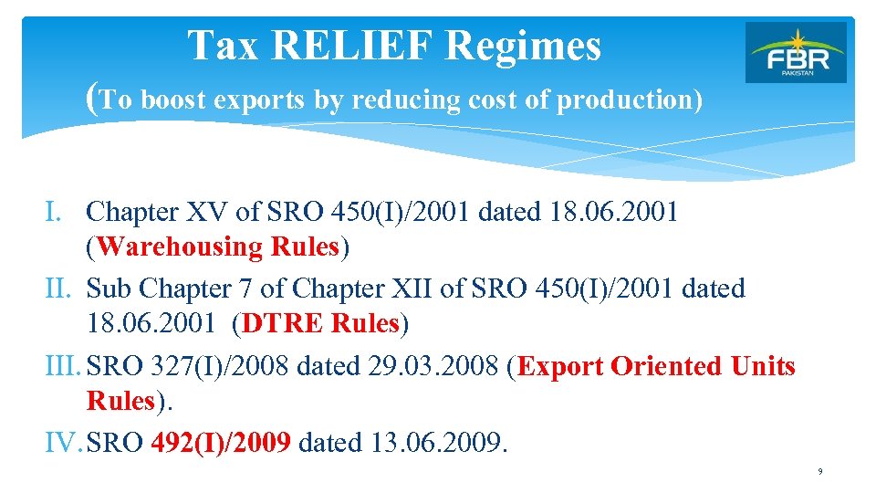 Tax RELIEF Regimes (To boost exports by reducing cost of production) I. Chapter XV of SRO 450(I)/2001 dated 18. 06. 2001 (Warehousing Rules) II. Sub Chapter 7 of Chapter XII of SRO 450(I)/2001 dated 18. 06. 2001 (DTRE Rules) III. SRO 327(I)/2008 dated 29. 03. 2008 (Export Oriented Units Rules). IV. SRO 492(I)/2009 dated 13. 06. 2009. 9