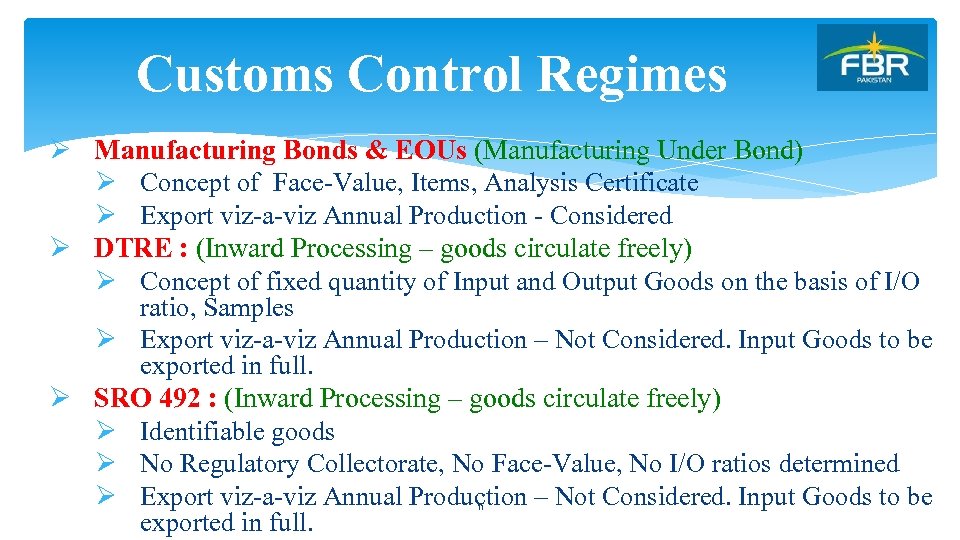 Customs Control Regimes Ø Manufacturing Bonds & EOUs (Manufacturing Under Bond) Ø Concept of Face-Value, Items, Analysis Certificate Ø Export viz-a-viz Annual Production - Considered Ø DTRE : (Inward Processing – goods circulate freely) Ø Concept of fixed quantity of Input and Output Goods on the basis of I/O ratio, Samples Ø Export viz-a-viz Annual Production – Not Considered. Input Goods to be exported in full. Ø SRO 492 : (Inward Processing – goods circulate freely) Ø Identifiable goods Ø No Regulatory Collectorate, No Face-Value, No I/O ratios determined Ø Export viz-a-viz Annual Production – Not Considered. Input Goods to be exported in full. 11