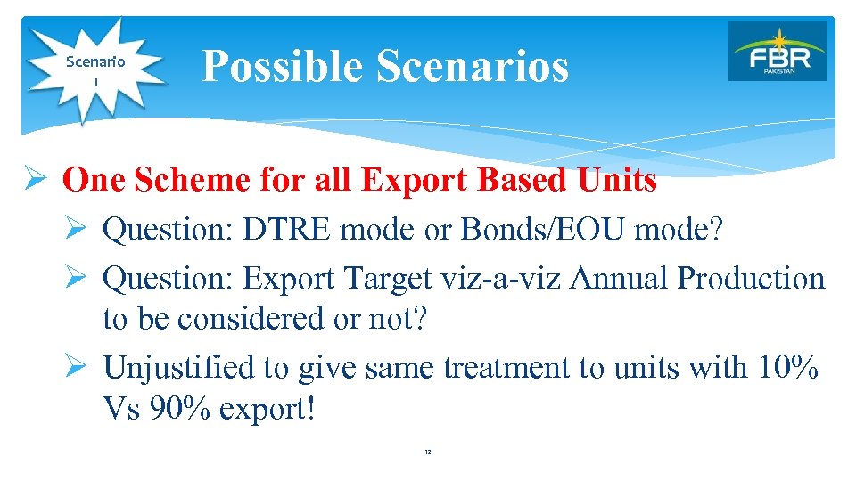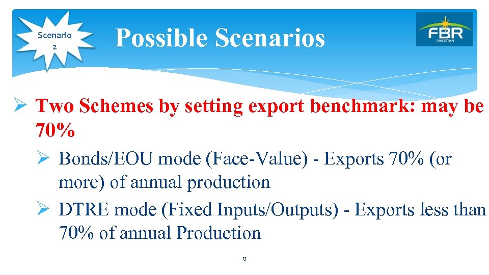 Scenario 1 Possible Scenarios Ø One Scheme for all Export Based Units Ø Question: DTRE mode or Bonds/EOU mode? Ø Question: Export Target viz-a-viz Annual Production to be considered or not? Ø Unjustified to give same treatment to units with 10% Vs 90% export! 12