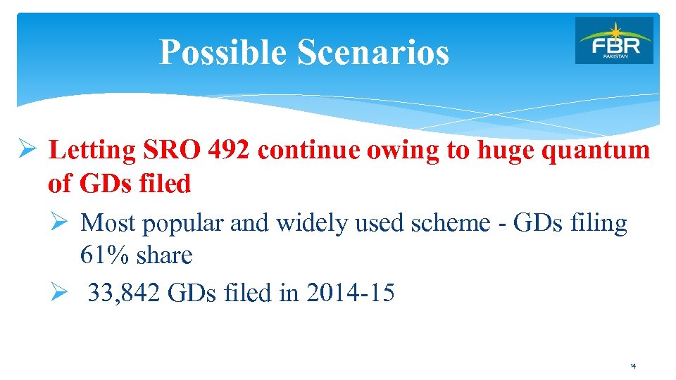Possible Scenarios Ø Letting SRO 492 continue owing to huge quantum of GDs filed Ø Most popular and widely used scheme - GDs filing 61% share Ø 33, 842 GDs filed in 2014 -15 14