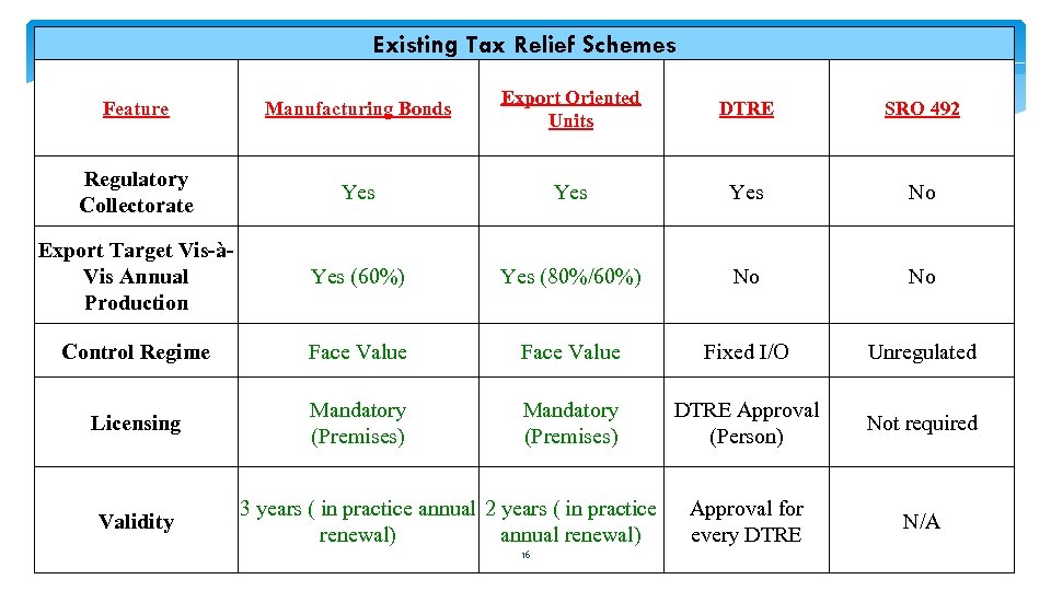 Existing Tax Relief Schemes Feature Manufacturing Bonds Export Oriented Units DTRE SRO 492 Regulatory Collectorate Yes Yes No Export Target Vis-àVis Annual Production Yes (60%) Yes (80%/60%) No No Control Regime Face Value Fixed I/O Unregulated Licensing Mandatory (Premises) DTRE Approval (Person) Not required Approval for every DTRE N/A Validity 3 years ( in practice annual 2 years ( in practice renewal) annual renewal) 16