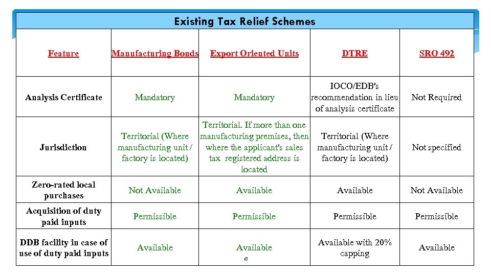 Existing Tax Relief Schemes Feature Eligibility for users Manufacturing Bonds Manufacturer-cumexporter Security prescribed Insurance Policy deleted for Licensing / DTRE vide SRO 202(I)/2014 Approval dated 18. 03. 2014 Export Oriented Units DTRE SRO 492 Manufacturer-cum- -exporter as well Manufacturer-cumexporter as commercial exporter Insurance Policy IB+PDC or BG or Corporate Guarantee as per category of applicant N. A Security prescribed for import stage Indemnity Bond + PDC Nil BG or Pay Order or IB+PDC I/O Ratio Determined Not determined Role of IOCO / EDB Optional Mandatory Not applicable 17