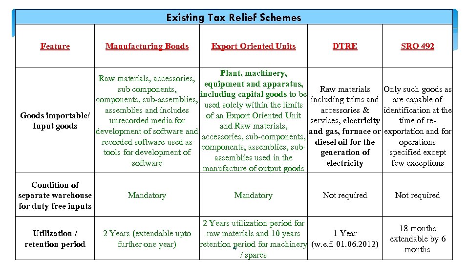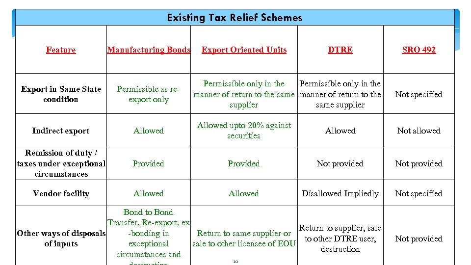 Existing Tax Relief Schemes Feature Manufacturing Bonds Export Oriented Units DTRE Export in Same State condition Permissible as reexport only Indirect export Allowed upto 20% against securities Allowed Not allowed Remission of duty / taxes under exceptional circumstances Provided Not provided Vendor facility Allowed Disallowed Impliedly Not specified Permissible only in the manner of return to the same manner of return to the supplier same supplier Bond to Bond Transfer, Re-export, ex Return to supplier, sale Other ways of disposals -bonding in Return to same supplier or to other DTRE user, of inputs exceptional sale to other licensee of EOU destruction circumstances and 20 SRO 492 Not specified Not provided