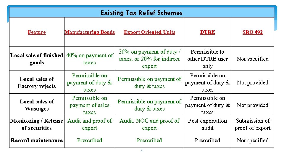 Existing Tax Relief Schemes Feature Manufacturing Bonds Local sale of finished 40% on payment of goods taxes Export Oriented Units DTRE SRO 492 20% on payment of duty / taxes, or 20% for indirect export Permissible to other DTRE user only Not specified Permissible on payment of duty & Not provided duty & taxes Permissible on Local sales of Permissible on payment of sales payment of duty & Not provided Wastages duty & taxes Monitoring / Release Audit and proof of Audit, NOC and proof of Post exportation Submission of of securities export audit proof of export Local sales of Factory rejects Record maintenance Prescribed 21 Prescribed Not specified