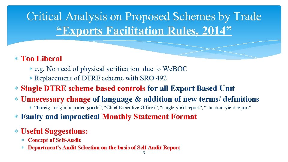 Critical Analysis on Proposed Schemes by Trade “Exports Facilitation Rules, 2014” Too Liberal e. g. No need of physical verification due to We. BOC Replacement of DTRE scheme with SRO 492 Single DTRE scheme based controls for all Export Based Unit Unnecessary change of language & addition of new terms/ definitions “Foreign origin imported goods”, “Chief Executive Officer”, “single yield report”, “standard yield report” Faulty and impractical Monthly Statement Format Useful Suggestions: Concept of Self-Audit Department's Audit Selection on the basis of Self Audit Report 23