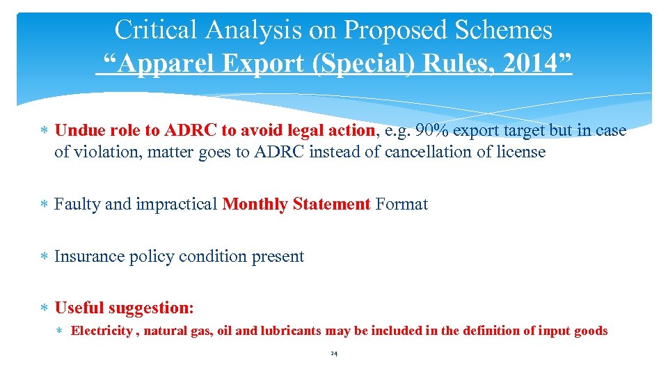 Critical Analysis on Proposed Schemes “Apparel Export (Special) Rules, 2014” Undue role to ADRC to avoid legal action, e. g. 90% export target but in case of violation, matter goes to ADRC instead of cancellation of license Faulty and impractical Monthly Statement Format Insurance policy condition present Useful suggestion: Electricity , natural gas, oil and lubricants may be included in the definition of input goods 24