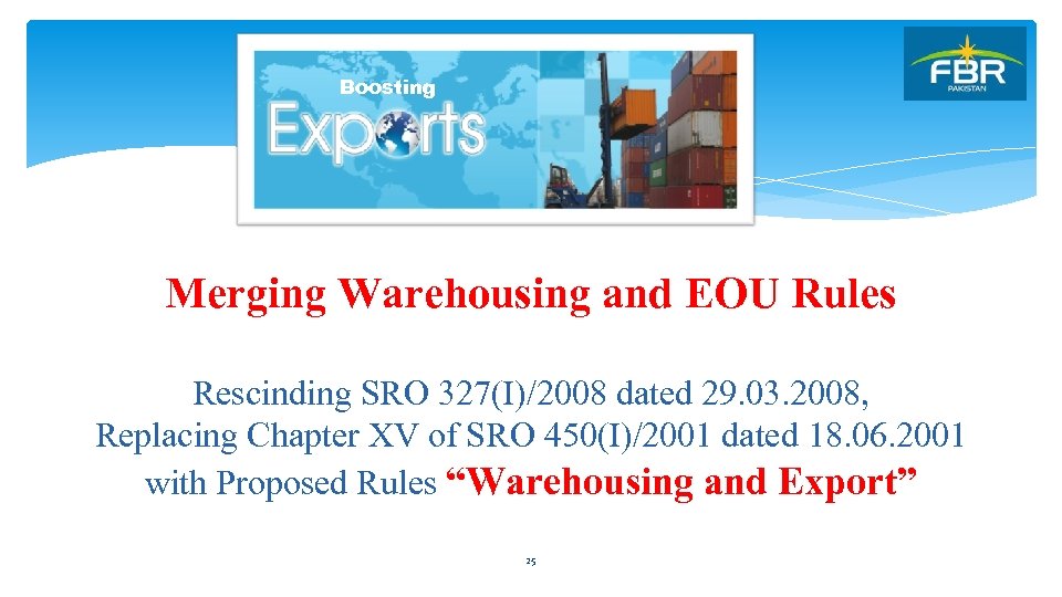Boosting Merging Warehousing and EOU Rules Rescinding SRO 327(I)/2008 dated 29. 03. 2008, Replacing Chapter XV of SRO 450(I)/2001 dated 18. 06. 2001 with Proposed Rules “Warehousing and Export” 25