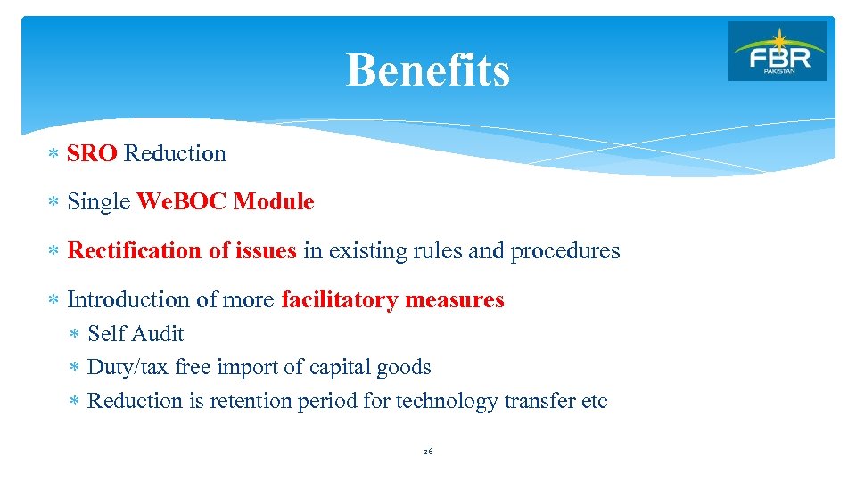 Benefits SRO Reduction Single We. BOC Module Rectification of issues in existing rules and procedures Introduction of more facilitatory measures Self Audit Duty/tax free import of capital goods Reduction is retention period for technology transfer etc 26