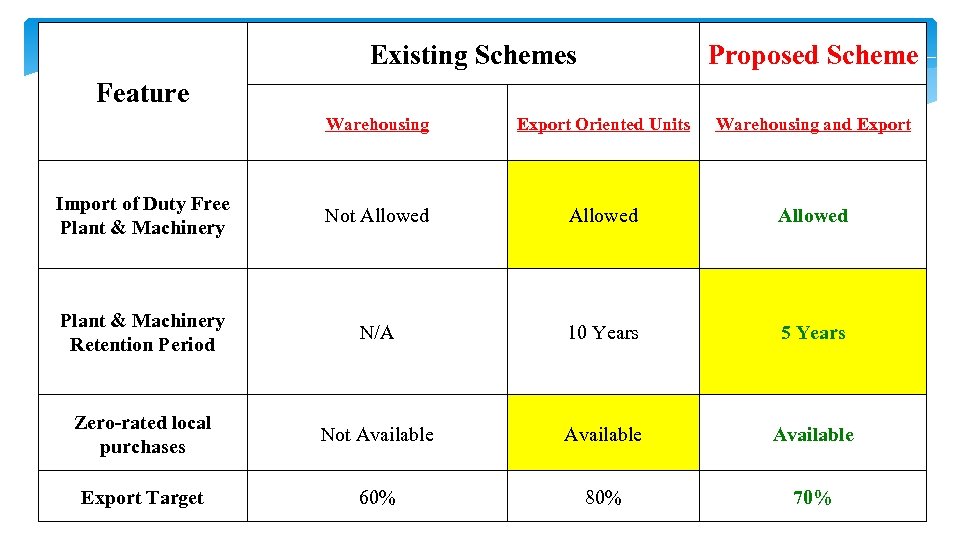 Existing Schemes Proposed Scheme Feature Warehousing Export Oriented Units Warehousing and Export Import of Duty Free Plant & Machinery Not Allowed Plant & Machinery Retention Period N/A 10 Years 5 Years Zero-rated local purchases Not Available Export Target 60% 80% 70% 27