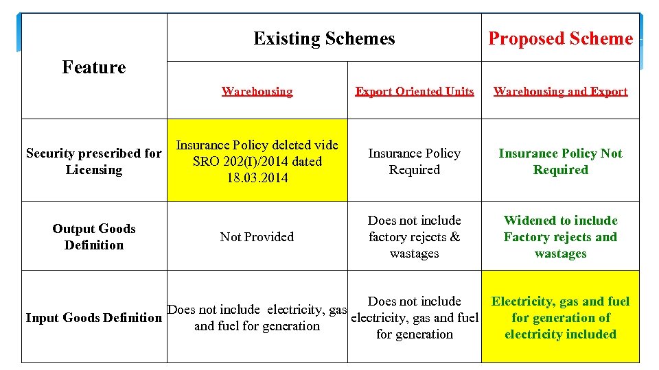 Existing Schemes Proposed Scheme Feature Warehousing Security prescribed for Licensing Output Goods Definition Export Oriented Units Warehousing and Export Insurance Policy deleted vide SRO 202(I)/2014 dated 18. 03. 2014 Insurance Policy Required Insurance Policy Not Required Not Provided Does not include factory rejects & wastages Widened to include Factory rejects and wastages Does not include Electricity, gas and fuel Does not include electricity, gas Input Goods Definition for generation of electricity, gas and fuel for generation electricity included 28
