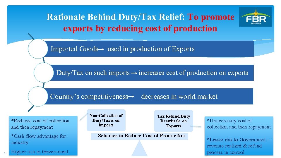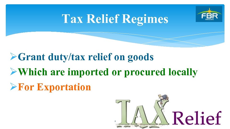 Tax Relief Regimes ØGrant duty/tax relief on goods ØWhich are imported or procured locally ØFor Exportation 2