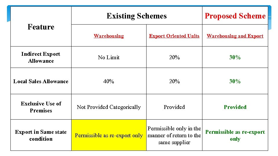Existing Schemes Proposed Scheme Feature Warehousing Export Oriented Units Warehousing and Export Indirect Export Allowance No Limit 20% 30% Local Sales Allowance 40% 20% 30% Exclusive Use of Premises Not Provided Categorically Provided Export in Same state condition Permissible only in the Permissible as re-export only manner of return to the only same supplier