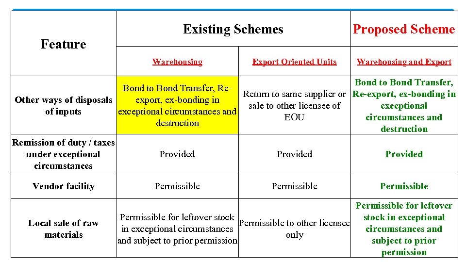 Feature Existing Schemes Warehousing Export Oriented Units Proposed Scheme Warehousing and Export Bond to Bond Transfer, Re. Return to same supplier or Re-export, ex-bonding in Other ways of disposals export, ex-bonding in sale to other licensee of exceptional of inputs exceptional circumstances and EOU circumstances and destruction Remission of duty / taxes Provided under exceptional circumstances Vendor facility Local sale of raw materials Permissible for leftover Permissible for leftover stock in exceptional Permissible to other licensee in exceptional circumstances and only and subject to prior permission subject to prior 30 permission