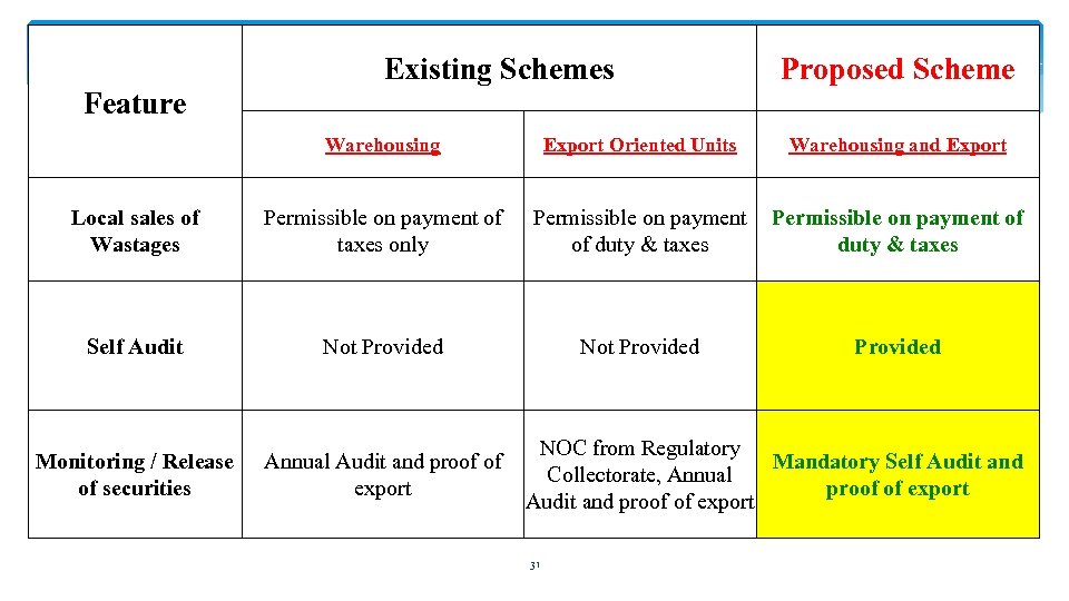 Feature Existing Schemes Proposed Scheme Warehousing Export Oriented Units Warehousing and Export Local sales of Wastages Permissible on payment of taxes only Permissible on payment of duty & taxes Self Audit Not Provided Monitoring / Release of securities Annual Audit and proof of export NOC from Regulatory Mandatory Self Audit and Collectorate, Annual proof of export Audit and proof of export 31