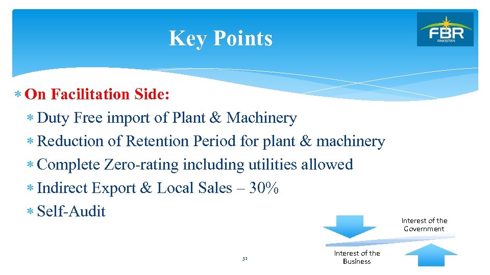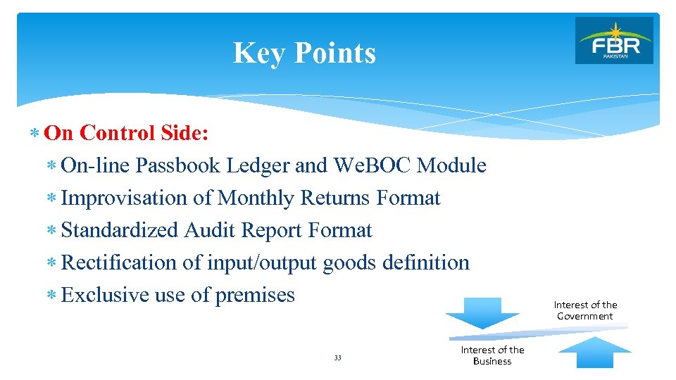 Key Points On Facilitation Side: Duty Free import of Plant & Machinery Reduction of Retention Period for plant & machinery Complete Zero-rating including utilities allowed Indirect Export & Local Sales – 30% Self-Audit 32 Interest of the Business Interest of the Government