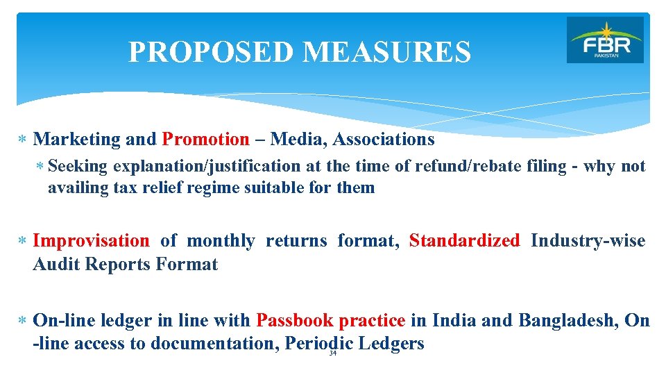 PROPOSED MEASURES Marketing and Promotion – Media, Associations Seeking explanation/justification at the time of refund/rebate filing - why not availing tax relief regime suitable for them Improvisation of monthly returns format, Standardized Industry-wise Audit Reports Format On-line ledger in line with Passbook practice in India and Bangladesh, On -line access to documentation, Periodic Ledgers 34