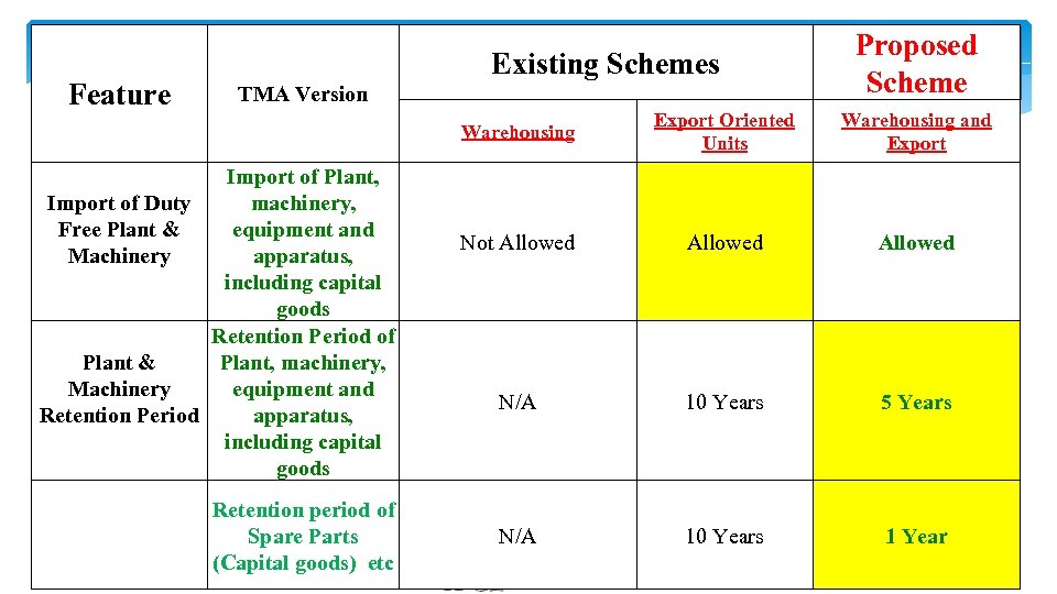 Feature Existing Schemes TMA Version Proposed Scheme Warehousing Import of Plant, machinery, Import of Duty equipment and Free Plant & Machinery apparatus, including capital goods Retention Period of Plant, machinery, Plant & equipment and Machinery Retention Period apparatus, including capital goods Export Oriented Units Warehousing and Export Not Allowed N/A 10 Years 5 Years N/A 10 Years 1 Year THANKS Retention period of Spare Parts (Capital goods) etc 35