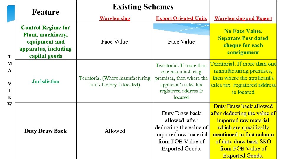 Feature T M A V I E W Control Regime for Plant, machinery, equipment and apparatus, including capital goods Jurisdiction Duty Draw Back Existing Schemes Warehousing Export Oriented Units Face Value Warehousing and Export No Face Value. Separate Post dated cheque for each consignment Territorial. If more than one manufacturing premises, one manufacturing Territorial (Where manufacturing premises, then where the applicant's unit / factory is located) applicant's sales tax registered address is is located Allowed 36 Duty Draw back allowed Duty Draw back after deducting the value of allowed after imported raw material deducting the value of which are specifically imported raw material mentioned in first column from FOB Value of of duty draw back SRO Exported Goods. from FOB Value of Exported Goods.