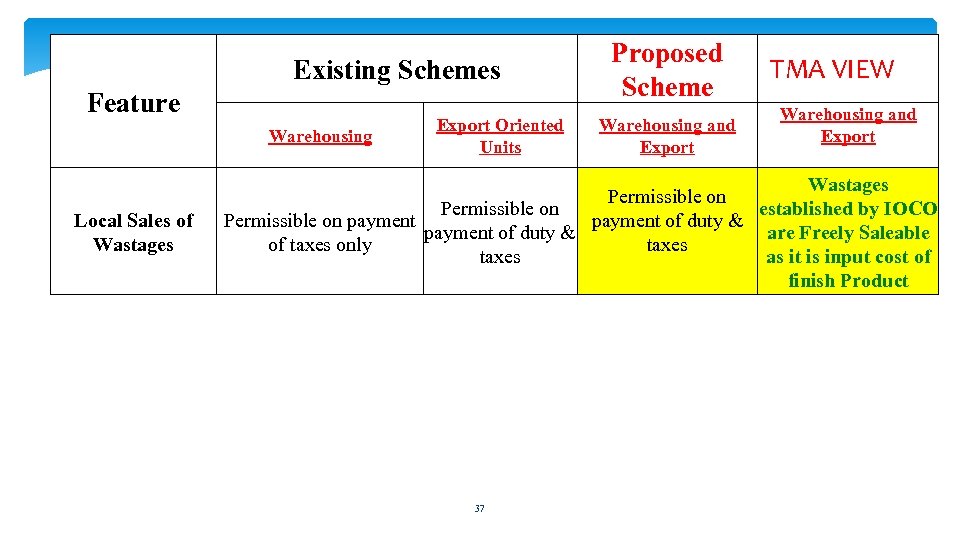 Existing Schemes Feature Warehousing Local Sales of Wastages Export Oriented Units Proposed Scheme Warehousing and Export TMA VIEW Warehousing and Export Wastages Permissible on established by IOCO Permissible on payment of duty & are Freely Saleable payment of duty & of taxes only taxes as it is input cost of finish Product 37