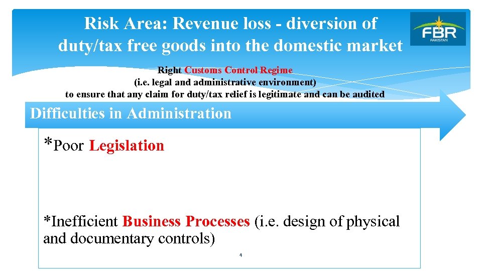 Rationale Behind Duty/Tax Relief: To promote exports by reducing cost of production Imported Goods used in production of Exports Duty/Tax on such imports Country’s competitiveness *Reduces cost of collection and then repayment *Cash-flow advantage for industry 3 Higher risk to Government Non-Collection of Duty/Taxes on Imports increases cost of production on exports decreases in world market Tax Refund/Duty Drawback on Exports Schemes to Reduce Cost of Production *Unnecessary cost of collection and then repayment *Lesser risk to Government – revenue realized & refund process in control