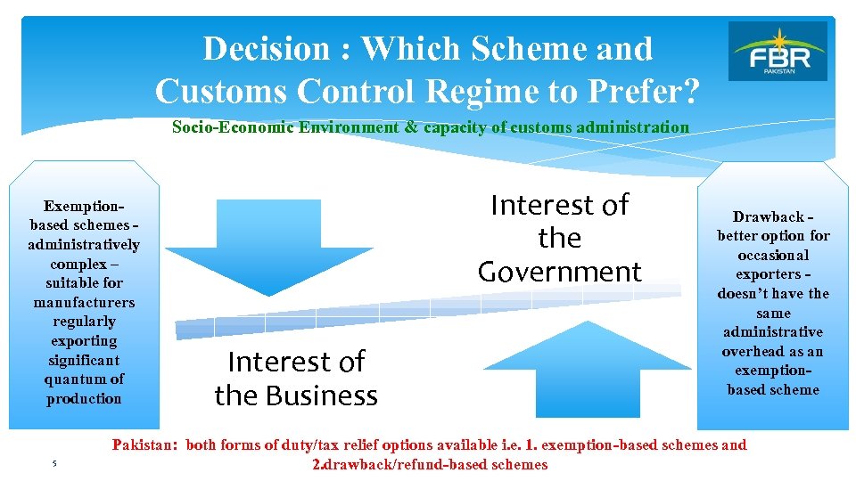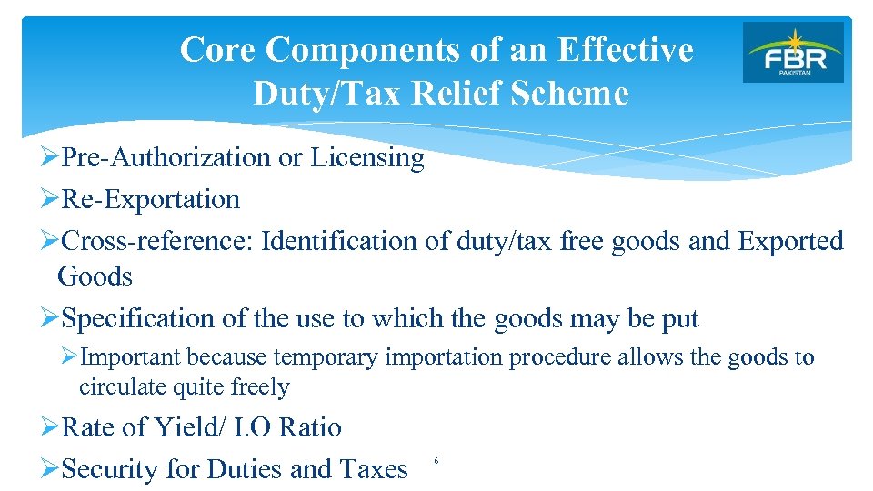 Decision : Which Scheme and Customs Control Regime to Prefer? Socio-Economic Environment & capacity of customs administration Exemptionbased schemes administratively complex – suitable for manufacturers regularly exporting significant quantum of production 5 Interest of the Government Interest of the Business Drawback better option for occasional exporters doesn’t have the same administrative overhead as an exemptionbased scheme Pakistan: both forms of duty/tax relief options available i. e. 1. exemption-based schemes and 2. drawback/refund-based schemes