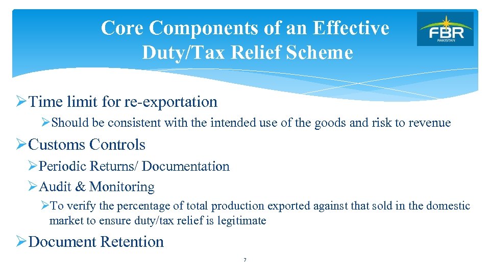 Core Components of an Effective Duty/Tax Relief Scheme ØPre-Authorization or Licensing ØRe-Exportation ØCross-reference: Identification of duty/tax free goods and Exported Goods ØSpecification of the use to which the goods may be put ØImportant because temporary importation procedure allows the goods to circulate quite freely ØRate of Yield/ I. O Ratio ØSecurity for Duties and Taxes 6