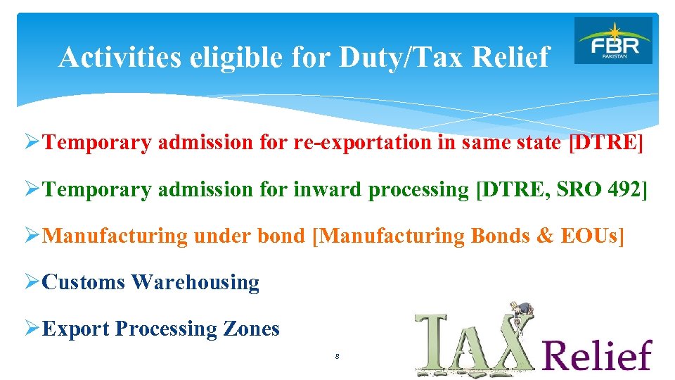 Activities eligible for Duty/Tax Relief ØTemporary admission for re-exportation in same state [DTRE] ØTemporary admission for inward processing [DTRE, SRO 492] ØManufacturing under bond [Manufacturing Bonds & EOUs] ØCustoms Warehousing ØExport Processing Zones 8