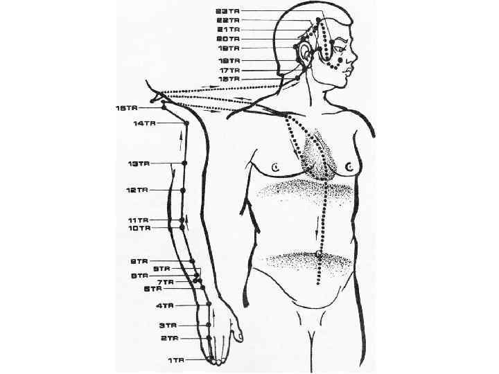 Патологические проявления в меридиане. • Припухлость и боли в горле, гортани, щеках, покраснение глаз, глухота, боли в заушной области, в плечевом суставе и по внешней поверхности рук и локтевого сустава, контрактура безымянного пальца кисти.