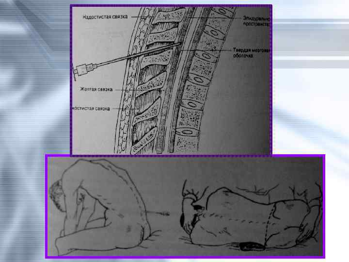 Осложнения • Инфекционные (эпидурит, менингит, абсцесс) • Эпидуральные гематомы • Токсическое действие препаратов, введённых в эпидуральное пространство. • Тотальный субарахноидальный блок. • Неврологические осложнения. • Задержка мочи • Понижение АД, брадикардия.