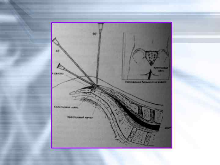 Противопоказания • отказ пациента • инфекция в зоне инъекции • коагулопатия или прием антикоагулянтов • киста копчика или какие-либо врожденные аномалии крестцовокопчиковой области, спинного мозга или его оболочек