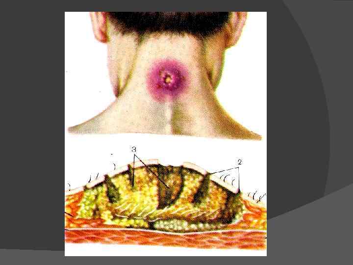 места локализации карбункулов задняя поверхность шеи, лопаточная и межлопаточная область, на ягодицах, пояснице, в редких случаях на конечностях, щеке. 24