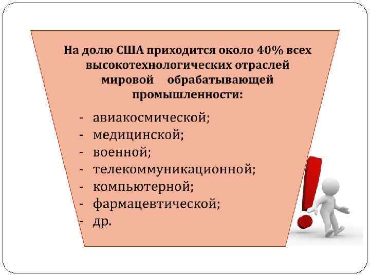 США занимают первую позицию в мире в 8 из 9 выделяемых важнейших технологий (кроме автомобильных технологий), таких как: Ø сельскохозяйственные Ø медицинские Ø энергетические Ø компьютерные Ø информационные Ø авиакосмические Ø композитные материалы Ø нанотехнологии