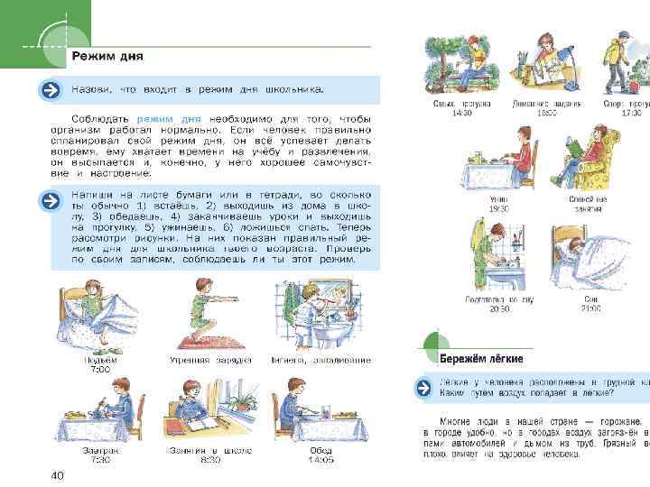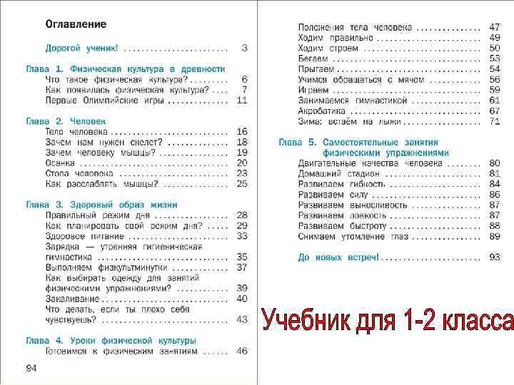 Разделы учебника для 1 -2 класса Содержание учебников отличает расширенный обзор различных систем физического воспитания разных стран, накопленных за многие тысячелетия развития мировой культуры. Сюда вошли сведения по таким системам физического воспитания и оздоровления, как система хатха-йоги, каратэ, ушу, индийская дыхательная система «пранаяма» и др. Тексты учебников иллюстрированы фотографиями, которые создают у школьников начальных классов правильно представление о технике выполнения того или иного упражнения.