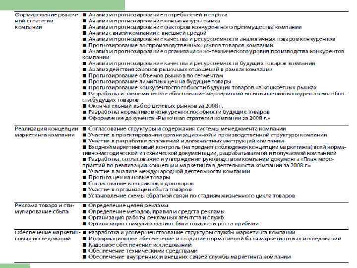перечень функций отдела маркетинга: o o o o проведение маркетинговых исследований по различным направлениям; анализ факторов микро- и макросреды маркетинга; выбор производственной политики, стратегии и тактики; прогнозирование и долгосрочное планирование производства; организация рекламной деятельности на предприятии; разработка новых видов продуктов; участие в процедуре установления цен на продукцию; организация продвижения продукта; обслуживание потребителя; организация выставок и ярмарок; организация плана-программы по маркетингу; контроль маркетинговой деятельности; координация деятельности основных структур предприятия. Эта функция характерна для наиболее развитого отдела маркетинга внутри маркетингово ориентированной организации.