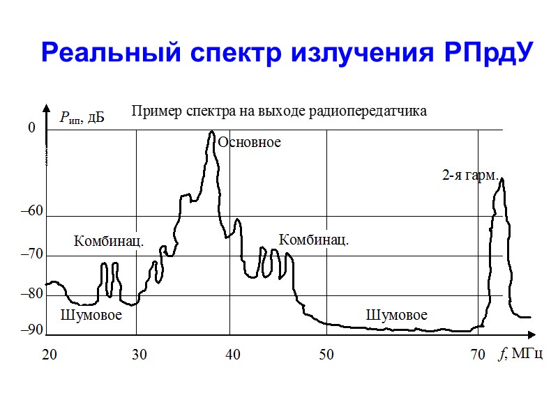 Шумовое излучение Шумовое излучение – излучение, обусловленное собственными шумами и паразитной модуляцией генерируемого колебания шумовыми процессами радиопередатчика. Для него характерны уровни – (80-100) дБ и очень широкая полоса (10-100 f). Из-за значительной ширины полосы шумовое излучение несмотря на низкий уровень может нарушать работу близко расположенных РЭС.
