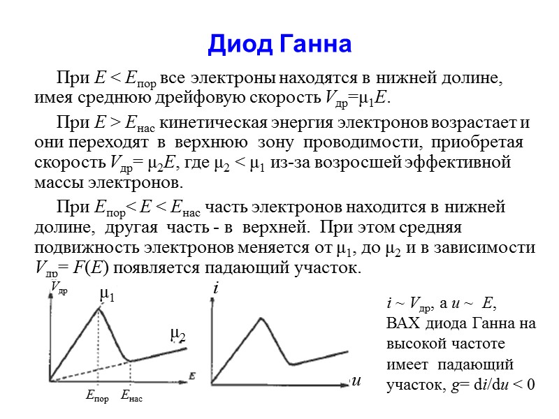 Диод Ганна При Е < Епор все электроны находятся в нижней долине, имея среднюю дрейфовую скорость Vдр=μ1E. При Е > Енас кинетическая энергия электронов возрастает и они переходят в верхнюю зону проводимости, приобретая скорость Vдр= μ2E, где μ2 < μ1 из-за возросшей эффективной массы электронов. При Епор< Е < Енас часть электронов находится в нижней долине, другая часть - в верхней. При этом средняя подвижность электронов меняется от μ1, до μ2 и в зависимости Vдр= F(E) появляется падающий участок. Епор Енас i μ1 μ2 Vдр u i ~ Vдр, а u ~ Е, ВАХ диода Ганна на высокой частоте имеет падающий участок, g= di/du < 0
