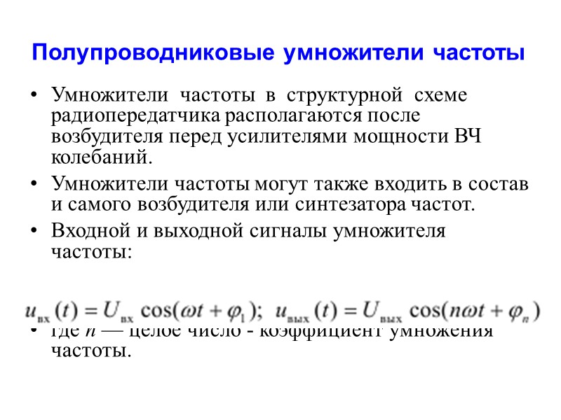 Полупроводниковые умножители частоты Умножители частоты в структурной схеме радиопередатчика располагаются после возбудителя перед усилителями мощности ВЧ колебаний. Умножители частоты могут также входить в состав и самого возбудителя или синтезатора частот. Входной и выходной сигналы умножителя частоты: где n — целое число - коэффициент умножения частоты.