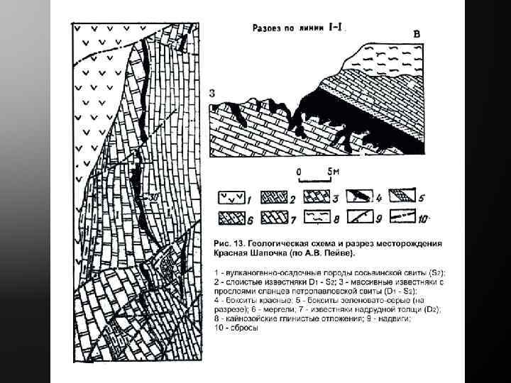 Рудный пласт и комплекс вмещающих пород имеет меридиональное простирание и падает на восток под углом 20 -30°. Бокситовый бассейн разделяется широтными сбросами и безрудными промежутками на ряд крупных площадей, которые условно названы месторождениями. Одно из них - Красная Шапочка протяженностью 7, 7 км. Красные маркие бокситы заполняют карстовые полости в известняках, а немаркие и яшмовидные тяготеют к склонам депрессий. Пестроцветные встречаются повсеместно.