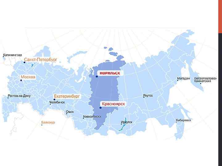 СУЛЬФИДНОЕ МЕДНО-НИКЕЛЕВОЕ ОРУДЕНЕНИЕ ВПЕРВЫЕ УСТАНОВЛЕНО В 1920 Г. q Северо-западная часть Восточной Сибири, юго-запад п-ова Таймыр. q Территориально располагается в КРАСНОЯРСКОМ КРАЕ РФ. q В средней части вогнутой формы мульды, в которой залегают более молодые слои, располагается город Норильск. q В Норильский рудный район входят сульфидные медноникелевые месторождения (Норильск-1, Талнахское, Октябрьское), а также месторождения угля, нефти, газа и нерудных полезных ископаемых. q Норильский рудный район занимает крайнюю северозападную окраину Сибирской платформы.