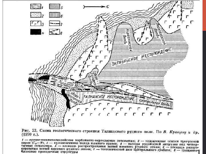 ГЕОЛОГИЧЕСКАЯ СТРУКТУРА Сформировалась под воздействием тектонических движений, имевших место в позднегерцинский период в Енисейской складчатой зоне. Основной структурный элемент района— Хантайско-Рыбнинский вал — ограничен с запада Норильско-Хараелахским, а с востока Имангдинским региональными глубинными разломами. Норильско-Хараелахский разлом, к которому приурочены главнейшие месторождения, фиксируется в виде линейной флексуры, вытянутой вдоль осей Норильской и Хараелахской мульд, разделенных небольшим антиклинальным поднятием. Рудные тела представлены крупными платообразными залежами, жилами и шлирами богатых сплошных сульфидных руд, находящимися в подстилающих интрузий породах, а также залежами вкрапленных руд в придонных частях интрузий и во вмещающих породах. Месторождения генетически и пространственно тесно связаны с дифференцированными интрузивами габбро-долеритов.